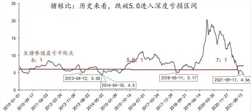 猪粮比低的时候农户养的猪越重,亏得就会越多,所以育肥的出栏体重就会下降,整体可以帮助加快养殖存栏的去化。我们看14年那个底部区域,猪粮比最低达到4.5,当年消费旺季猪价反弹后,15年二次探底,但没再创新低。18年那个底部区域,猪粮比也是在消费淡季的五月达到最低点,目前的猪粮比再次进入深度亏损中,极限价格可以判断基本探明。根据历史过往经验,一般周期底部行业深度亏损时间大概持续6个月左右。