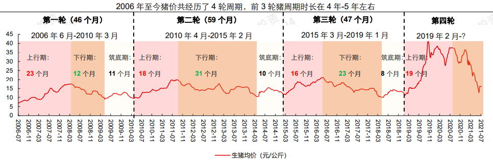 由于农业部历史能繁母猪统计口径发生了改变,没有真实的数据,和20年开始国家统计局公布的季度数据有很大出入,所以两组数据不能放在一起看,但我们可以参考以往周期能繁殖母猪存栏的下降去化的幅度,来判断猪周期的曙光来临走到了哪一个阶段。