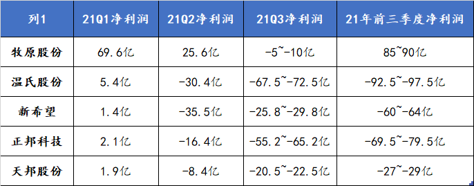 刚刚过去的第三季度猪肉价格走势让我们充分感受到了底部割肉踩踏的至暗时刻,旺季消费非但没有迎来价格反弹,反而迎来了预期落空后压栏大猪、淘汰母猪以及冻肉贸易的集中抛售割肉。从几个上市公司的三季报业绩预告中也可以看出,由于非瘟防疫、饲料成本、高价外购仔猪和现货价格的极度低迷,整个生猪养殖行业陷入历史最大的深度亏损季,真是无一幸免,惨不忍睹。