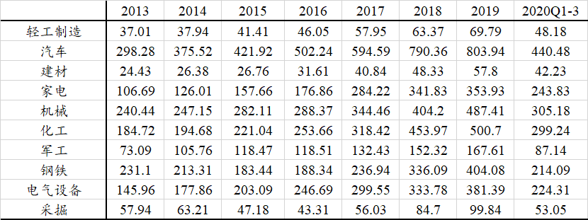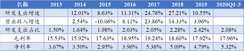 笔者在申万一级行业中挑选了更加传统的制造业(轻工制造、汽车、建材、家电、机械、化工、军工、钢铁、电气设备、采掘)做了一个数据统计。以上述10个行业中的900多家2014年之前上市的公司为样本,统计数据发现自2014年以来这900多家上市公司的研发支出增速最低为8.63%,在2017-2018年均达到20%以上,且研发支出占比从2013年的1.5%提升到2019年的2.42%。