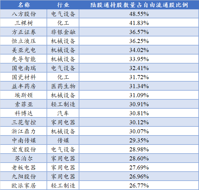表3:2021年4月7日陆股通持股数量占自由流通股百分比前20名