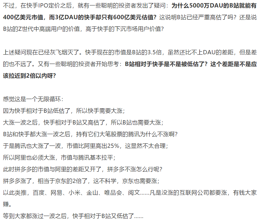 前段时间快手上市,当天收盘暴涨160%,一众投资人纷纷直呼看不懂,比如一个我关注的博主就发了一条这样的段子: