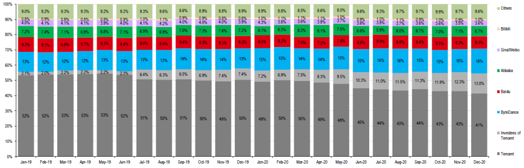 对比最基础的用户时长数据,美国的用户使用最多的Alphabet(谷歌母公司,拥有Chrome浏览器、YouTube、地图等一系列谷歌全家桶应用)也只占到了用户时长的25.6%。而在国内,仅腾讯系在巅峰时期就可以占到50%+的用户时长,说起来腾讯从2018年初起股价横盘了近2年时间,除了由于游戏版号暂停发放带来的负面冲击外,也有部分原因是投资者担心腾讯系微信的用户时长被字节系侵蚀。