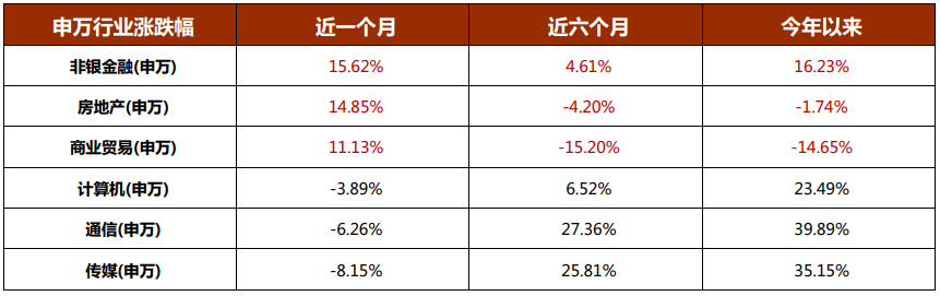 全月沪深300上涨4.48%,恒生指数上涨6.15%。板块上看,非银金融、房地产、商业贸易、建筑材料、钢铁等涨幅居前;而年初以来领涨的人工智能TMT板块逆势调整,下跌明显,显示了边际资金的跷跷板效应。