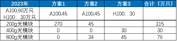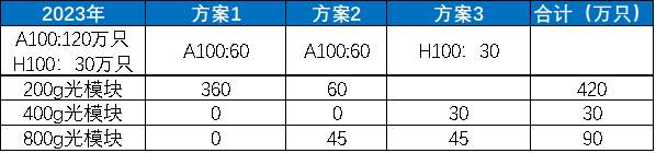 情景二:假设2023年A100出货120万只,H100出货30万只,仅考虑方案1-3的组合,则800G光模块需求90万只。