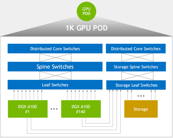 网络架构:英伟达DGX A100 SuperPOD的网络结构,采用三层IB-胖树架构,包括核心层、脊层和叶层。计算与存储网络分开构建,采用200G交换机。