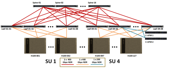 英伟达DGX H100 SuperPOD的网络结构为两层叶脊架构,计算与存储网络同样分开构建,采用800G交换机。