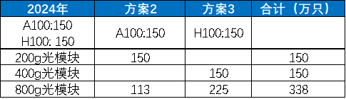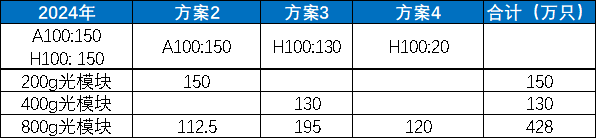 情景四:假设2024年A100出货150万只,H100出货150万只,考虑方案2-4的组合,则800G光模块需求达428万只。