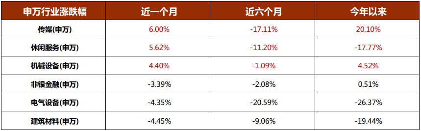 板块行情乏善可陈,短剧出海、AI应用的传媒板块全月涨幅领先,上涨6%,其次休闲服务、机械设备、医药生物、汽车等涨幅靠前;而建筑材料、电气设备、非银金融、有色金属、银行等板块跌幅靠前。