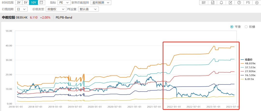 音乐是什么时候停止的呢?我们观察到这样的外延增长模式在21年7月双减政策之后出现了拐点,负反身性开始体现。虽然教育双减政策针对K12教育(主要是K9),事实上对高教学校并购扩张并未有明确限制,但二级市场投资人在线性外推的预期下,对民办高教受到政策监管的担忧爆发,导致港股民办高教板块集体经历了 “ 杀估值 ” 行情。截止目前为止,港股高教大多估值在10倍PE以下,有些甚至5倍都不到,距离高点20倍PE以上的估值水平相差甚远。