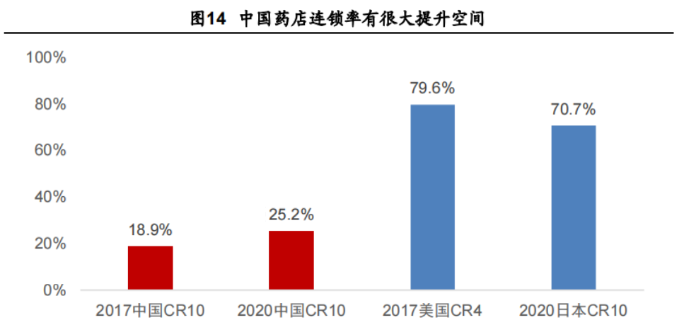 另一方面,还有很多行业依然处于正反身性中,比如连锁药店。药店行业供给侧也非常分散,根据华安证券研究,2020年的中国连锁药店前10集团市场份额为25%,虽然相比17年19%的集中度已有所提升,但对比美国和日本70%以上的集中度仍有较大差距。趋势上来看,头部药店集团正在通过开店,加盟和并购积极扩张,实现供给侧整合。