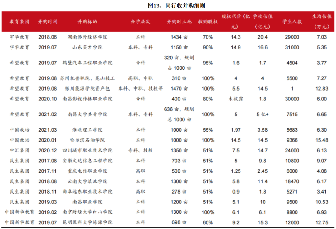 ② 一级市场单体学校的收购估值普遍低于二级市场学校集团估值。