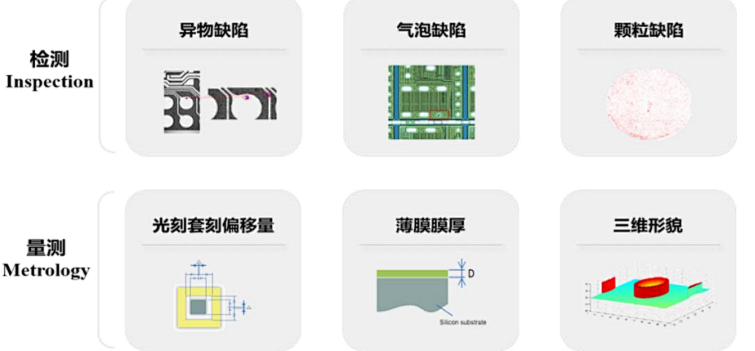 量检测设备用于对生产过程中间的晶圆半成品进行检查,确保晶体管结构和目标设计相符:1)在试生产、工艺研发和芯片流片阶段能加速开发流程;2)在批量生产阶段能够找到设备参数的偏移,及时纠正设备、工艺过程的故障和错误。