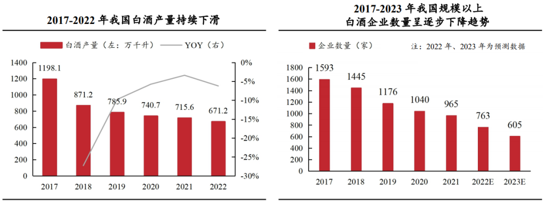 白酒行业早已经进入了内卷时代。根据东亚前海证券研报,2022年国内白酒产量相比2017年下滑43.98%,已经连续六年下滑。白酒规模以上企业数量也持续下滑,由2017年的1593家下滑到2022年的763家。白酒行业早在2017年就进入了 “ 销量负增长 ” 的内卷时代,中小酒企经营困难,不断退出。对于资本市场上头部的酒企来说,“ 行业内卷 ” 反而是提升市占率的机会,从销售额口径来看,前十名白酒公司的市场份额持续提升,由2019 年的41.0%增加至2021年的49.7%,预计2022年还在持续提升。这也是为什么资本市场并没有感受到行业内卷的原因之一,头部酒企还在持续量价齐升。