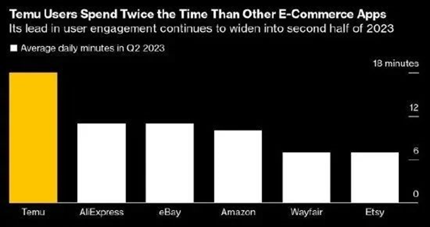 以Temu为例,仅仅在上线一年后,2023Q3的销售额就突破50亿美金,全年有望突破180亿美金。据统计,美国消费者在Temu应用程序上的平均每日使用时长达18分钟,而相比之下,亚马逊的平均每日使用时长仅为10分钟。