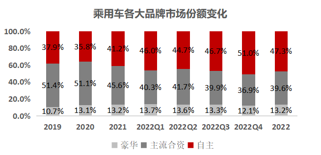 “ 两个50% ” :电动车时代自主车企市占率不断提升,2022年四季度,自主车市场份额在零售与批发端首次突破50%以上,缔造中国汽车行业新的里程碑;同时自主品牌车的电动车渗透率也率先突破50%,引领全行业。