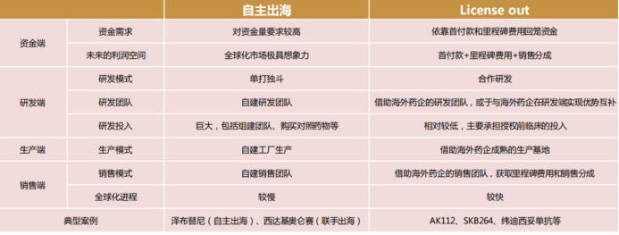 出海模式主要分为:自主出海、License out(授权合作)。目前授权合作是国内创新药出海的主要模式,相比自主出海,旱涝保收的对外授权模式,无疑更具性价比。一方面,通过license out国内药企可以将药物的研发风险,与海外药企共担。另一方面,海外跨国大药企通常都有丰富的市场经验和销售网络,国内药企可以借助这些合作伙伴的本地化资源和渠道优势,快速适应海外市场的法规要求和市场需求。这样的合作能够很大程度让国内药企规避了在陌生市场 “ 水土不服 ” 的风险。