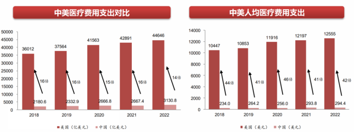 2022年中美医疗费用支出仍存在14倍的差距,人均医疗费用仍有42倍的差距。