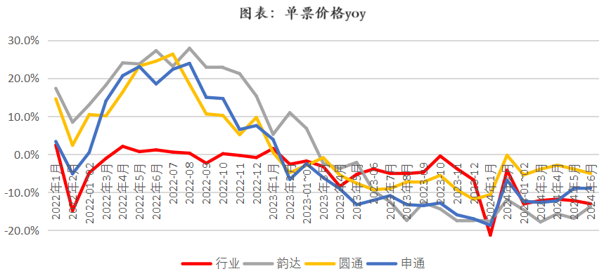 但是,我们也观察到,近期单票价格波动已逐渐收窄:24年1-6月,韵达/圆通/申通单票价格下降约2毛,去年同期单票价格则下降了4毛左右。并且头部玩家也罕见地开始追求利润,而非优先强调件量市占率。