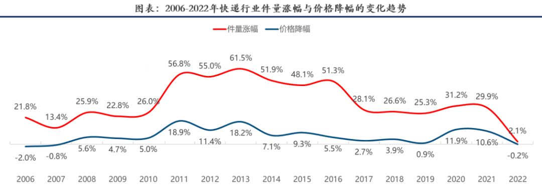 ② 20-21年:由于各大快递商于16-17年纷纷上市,借助资本通过2-3年时间完成了产能大扩张,成本获得了大幅下降,加之疫情导致需求回落,因此出现了持续一年半的价格战,直至2021年Q3价格监管政策落地;