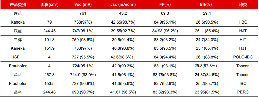 PERC量产转换效率23%+,正逐步接近理论极限,以TOPCon、HJT、BC为代表的N型技术开始崛起,并开始从实验室、中试,逐步走向规模化量产。未来,随着叠层电池技术的发展,光伏技术可展望的效率甚至可以突破40%,在这样大的提升空间下,25%的量产技术似乎也仅仅只是开始。