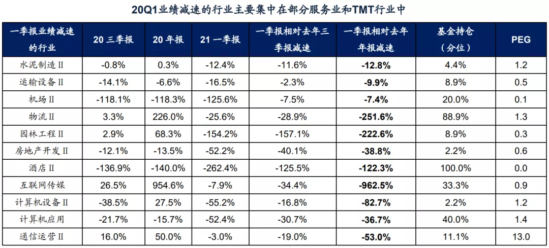 结构上看,一季报盈利加速的行业主要集中在出口链(中游制造)和出行链(部分消费服务业), 盈利减速的行业主要集中在TMT和部分服务业中。