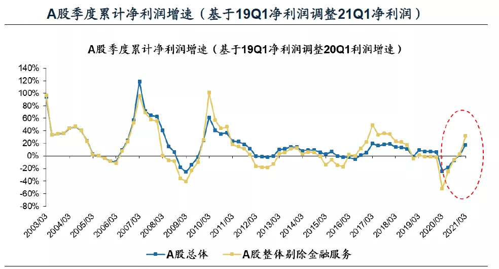 4月底全部A股的2021一季报都出台完毕。2021年,A股一季报利润显著改善。根据广发策略统计(用19Q1的净利润调整计算21Q1的净利润同比增速):A股整体一季报利润增速17.98%(年报利润增速1.76%);A股剔除金融一季报利润增速32.01%(年报利润增速3.27%)。