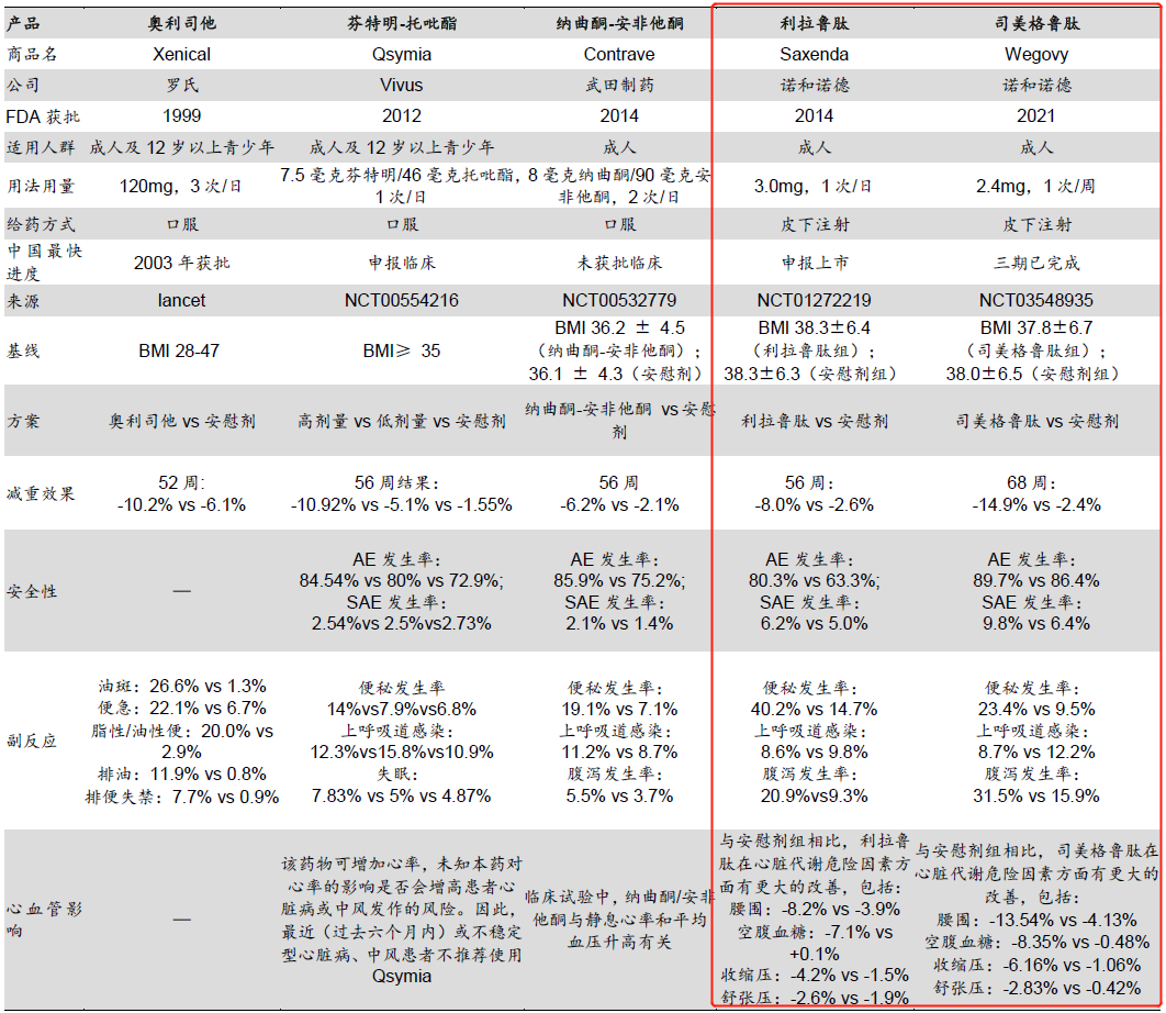图5:全球减肥药物减重效果及安全性对比