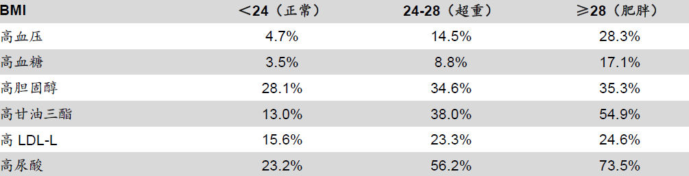 图3:不同BMI人群的常见慢性病指标异常检出率