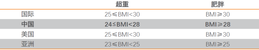 BMI指数(体重/身高的平方,kg/m2)是诊断是否肥胖的通用标准,各国肥胖范围有所不同。根据WHO定义,当BMI≥25时为超重,BMI≥30时为肥胖;根据中国的定义,当BMI≥24时为超重,BMI≥28时为肥胖。