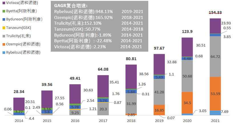 凭借显著的疗效,GLP-1 得到了市场的广泛认可,在糖尿病药物中的占比逐步提高,在美国市场上成为仅次于胰岛素及类似物的第二大糖尿病药物。如今,全球共有8款GLP-1激动剂降糖药上市,分别是艾塞那肽、利拉鲁肽、利司那肽、 阿必鲁肽、度拉糖肽、贝那鲁肽、司美格鲁肽、洛塞那肽;2021年GLP-1激动剂全球销售收入超过150亿美金。
