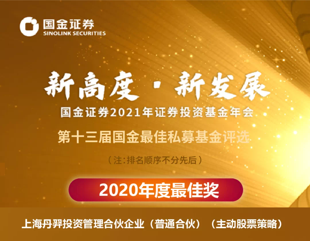 2021年4月22日,由国金证券主办的 “ 新高度·新发展--2021年证券投资基金年会 ” 在北京举行。丹羿投资荣获第十三届国金最佳私募基金评选 “ 2020年度最佳奖(主动股票策略)”。
